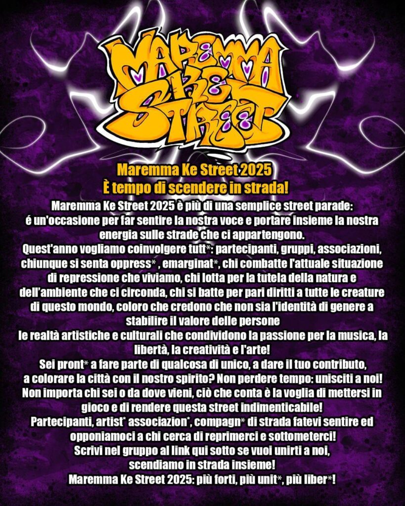 Di seguito l’annuncio completo della prossima street parade a Grosseto. Tutti invitati e tutte invitate a parteciparvi!
